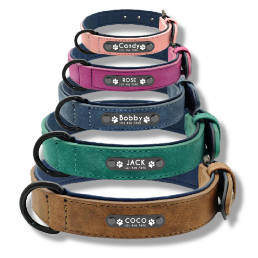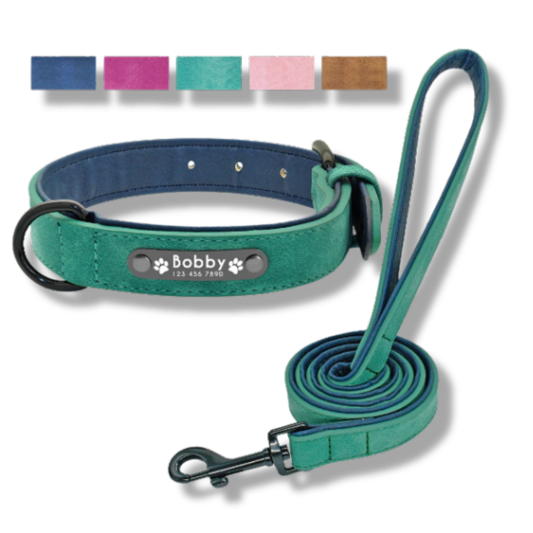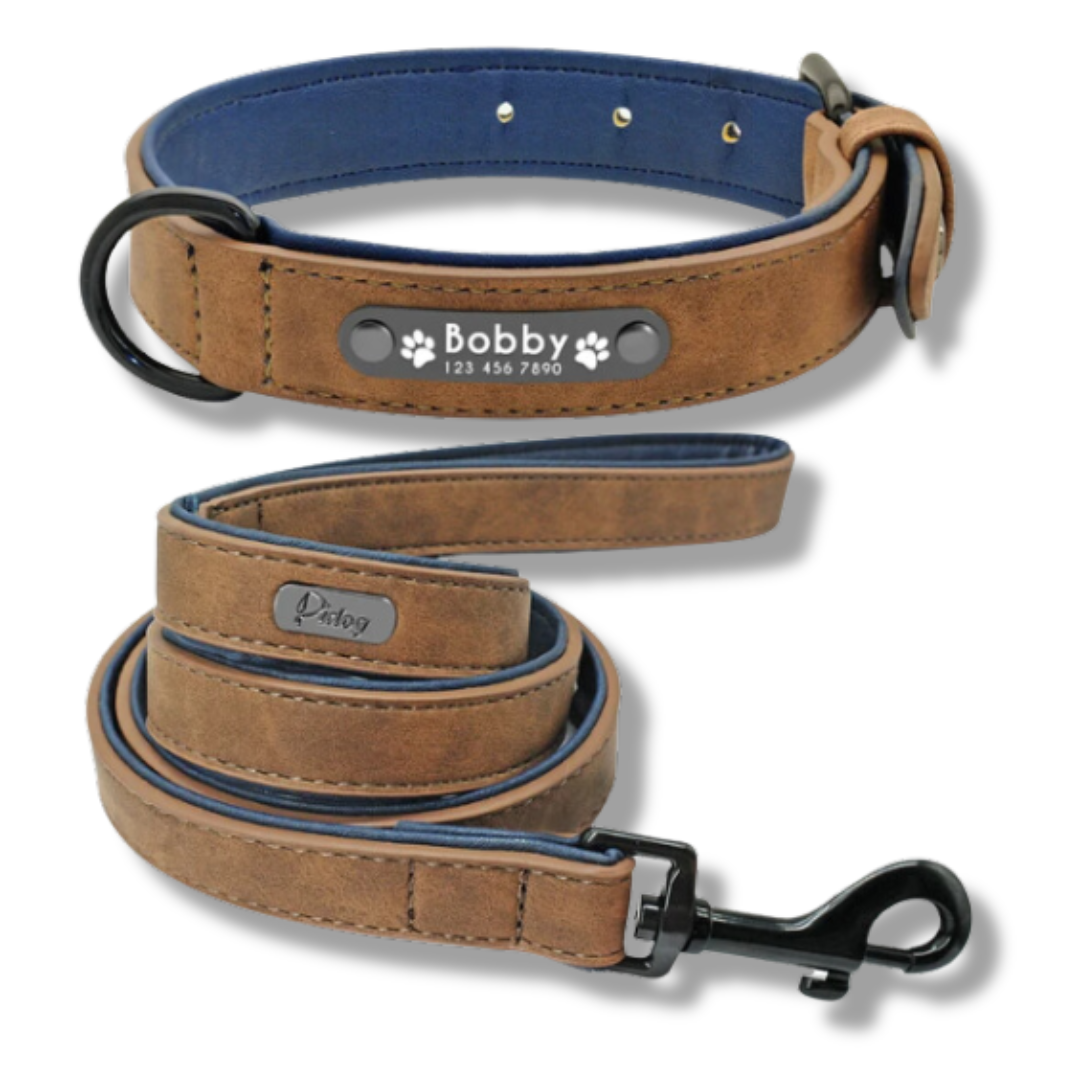 Discover our exclusive dog collar set that combines luxury and functionality. This set includes a personalized dog collar and a matching leash, both made from high-quality leather and padded for maximum comfort and durability. It’s perfect for breeds like Bulldogs, Pitbulls, and others.